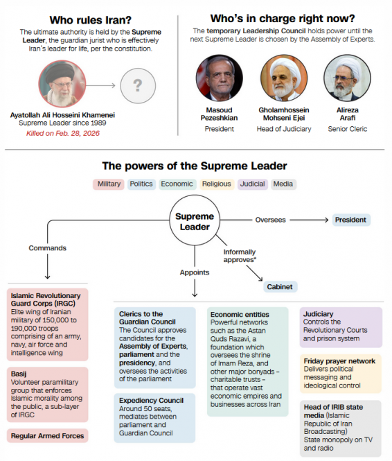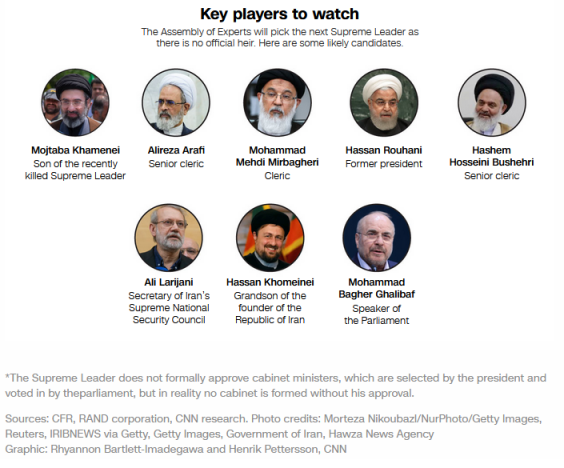 哈梅内伊的去世使中东陷入不确定性之中。伊朗高级官员已举行虚拟会议,以选出一位新的最高领导人——而哈梅内伊的儿子穆杰塔巴·哈梅内伊则是少数几位被指为可能接任的神职人员之一。但时机尚不明确。